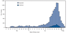 The first infected was registered in San Diego, California, on April 2, but it was misclassified as an H2N3 case.[13] It was not until April 13, with the first death in Oaxaca,[14] that further research was carried out, officially detecting the new type of virus on April 16.[15] The pandemic outbreak was first detected in the Federal District, where surveillance began picking up a surge in cases of influenza-like illness starting on March 18.[16] The surge was assumed by authorities to be "late-season flu" (which usually coincides with a mild Influenzavirus B peak[17]) until April 21,[18][19] when a CDC alert concerning two isolated cases of a novel swine flu was reported in the media (see 2009 swine flu outbreak in the United States).[20] Both cases were in US counties on the Mexico – United States border, adjacent to one state in Mexico where the influenza surge had been detected. This was the missing link that connected the surge and the new strain, and established the high suspicion of an outbreak. One study estimated that by the end of April, at least 113,000 to 375,000 people in Mexico had been infected.[21] Then, in early May, influenza activity began to decline, likely due to the shutdown of most public places in response to the outbreak. However, H1N1 remains present in Mexico, and as of December, was classified by WHO as widespread.