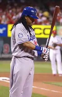 The Dodgers traveled to Cincinnati to begin their second road trip of the season. Chad Billingsley only lasted three innings in the series opener against the Reds, as the Dodgers fell behind 9–2 early on. A three-run home run by Matt Kemp keyed a comeback that tied the game at 9, but Ramón Troncoso allowed two runs in the bottom of the eighth and the Dodgers lost 11–9.[57] In the second game against the Reds, the Dodgers won 14–6, led by home runs by Kemp and Ethier and a two-run double by Rafael Furcal.[58] Manny Ramirez delivered his 1,800th career RBI with a single in the fifth inning, the 19th player in MLB history to reach that mark.[59] In the series finale, the Dodgers got nine hits and belted two homers (including a pinch-hit two run shot by Garret Anderson) but two costly errors and two blown leads by the bullpen late in the game were too much to overcome, as they lost 8–5 to the Reds.[60] In the series opener against the Washington Nationals, Adam Dunn hit two home runs off Haeger and the Dodgers lost 5–1.[61] On April 24, Carlos Monasterios notched his first career victory and Casey Blake hit two home runs in the Dodgers 4–3 win in 13 innings.[62] Chad Billingsley rebounded to turn in his first quality start of the season on April 25, allowing just one earned run in six innings, but the Dodger offense was shut down by Nationals pitching and the team lost 1–0.[63] The Dodgers next traveled to New York to take on the Mets. The scheduled first game of the series was rained out, forcing the Dodgers and Mets to play a doubleheader on April 27. In the first game, Johan Santana and two relievers shut out the Dodgers 4–0, the Dodgers second consecutive shut out defeat.[64] The Dodgers also lost Game 2, by a score of 10–5 as Haeger and the bullpen were beaten up.[65] In the series finale, the Dodgers lost 7–3 as AAA pitcher John Ely made his Major League debut. The sweep finished off a disappointing 2–7 road trip for the Dodgers.[66]