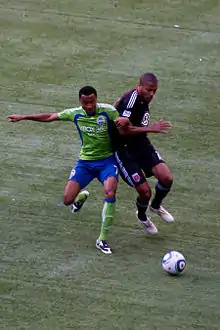 The Sounders FC began June with a 3–0 win against the New England Revolution at home, ending the scoreless pattern. Leo González scored in the fifth minute and started a 3-goal streak. Steve Zakuani volleyed in another goal in the 24th minute off of a kick by Brad Evans. The final goal of the match was scored by Fredy Montero in the 42nd minute, while the second half was more defensive.[33] During the final MLS match before the World Cup break, D.C. United defeated the team 3–2 in a nationally televised game. Chris Pontius scored all three of D.C.'s goals, two in the first half and one in the second. In the 90th minute, James Riley scored a goal and was accompanied by Montero's goal one minute later.[34]