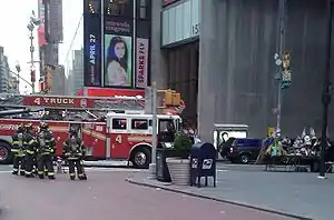 Meanwhile, Alioune Niasse, a Senegalese immigrant who sells photographs on the Square, was among those who noticed the vehicle and alerted a mounted policeman.[18] The vehicle had been parked on a tourist-crowded block at the eastern corner of 1 Astor Plaza (intersection of West 45th Street and Broadway), near the entrance to the Minskoff Theatre which was housing the musical The Lion King.[19][20][21][22][23] The police officer approached the Pathfinder to investigate, and observed the smoke, canisters inside, and the smell of gunpowder.[17] He immediately called for backup, a bomb disposal team, and the Fire Department.[24]