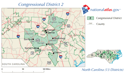 The 2nd district included Sanford and parts of Fayetteville and Raleigh.[25] The district's population was 58 percent white, 29 percent black and 11 percent Hispanic (see Race and ethnicity in the United States Census); 80 percent were high school graduates and 18 percent had received a bachelor's degree or higher. Its median income was $42,945.[26] In the 2008 presidential election the district gave 52 percent of its vote to Democratic nominee Barack Obama and 47 percent to Republican nominee John McCain.[25] In 2010 the district had a Cook Partisan Voting Index of R+2.[7]