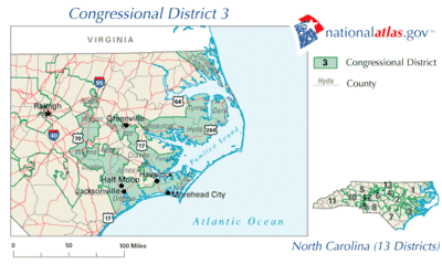 The 3rd district included Jacksonville and parts of Greenville and Wilson.[46] The district's population was 75 percent white, 17 percent black and 6 percent Hispanic (see Race and ethnicity in the United States Census); 86 percent were high school graduates and 23 percent had received a bachelor's degree or higher. Its median income was $46,958.[47] In the 2008 presidential election the district gave 61 percent of its vote to Republican nominee John McCain and 38 percent to Democratic nominee Barack Obama.[46]