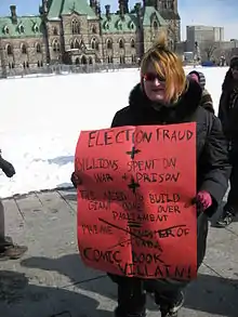 Protests began on March 3, 2012, with approximately 250 people rallying in Vancouver, British Columbia.[133] Protests spread across Canada,[134] with a protest held in Ottawa on March 5, 2012[135] and with protests taking place across 27 Canadian cities on March 11, promoted by groups including the Council of Canadians. The protest at Parliament Hill in Ottawa attracted between 40 and 100 people.[135][136] A petition calling for an inquiry into the robocall scandal had accumulated 37,000 signatures by March 3, 2012.[137]
