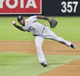 The Dodgers began the month of June where they left off in May, losing their fifth straight game. This time they committed four errors and were pounded by the Colorado Rockies 13–3 at Coors Field.[77] In that game, the Dodgers set a Major League record by having five sons of former Major Leaguers in the lineup at the same time (Tony Gwynn, Jr., Jerry Hairston, Jr., Iván DeJesús, Jr., Dee Gordon and Scott Van Slyke). It was also the first time a starting infield of four major league sons had ever occurred: first baseman Van Slyke, second baseman Hairston, third baseman De Jesus and shortstop Gordon.[78] The losing streak came to an end the next day, when they got a strong pitching performance from Aaron Harang and some timely hitting, including Bobby Abreu's first homer as a Dodger, in a 6–2 win.[79] However, the Dodgers offense went back into hibernation the next day as they dropped the series finale to the Rockies 3–2.[80] The Dodgers road trip continued on June 4 as they traveled to Citizens Bank Park to open a four-game series against the Philadelphia Phillies. Dee Gordon hit a triple to lead off the ninth against Phillies closer Jonathan Papelbon and then scored on a single by Elián Herrera to give the Dodgers the winning margin in the 4–3 victory.[81] Herrera came through the next night as well, hitting a two-RBI double off Cliff Lee in the top of the eighth to give the Dodgers the go-ahead run in a 2–1 victory over the Phillies.[82] Dee Gordon delivered a two-run single during the Dodgers three-run sixth inning on June 6 as they again came from behind to beat the Phillies, this time by a score of 6–5. Kenley Jansen picked up his third save in three days against the Phillies.[83] The Dodgers, helped by three Phillies errors, swept the series with an 8–3 victory in the series finale. The victory was the 100th career win for pitcher Aaron Harang and the team's first ever four-game series sweep in Philadelphia.[84] The Dodgers continued the lengthy road trip with a cross-country flight to Seattle to take on the Mariners in interleague play. In the opener Nathan Eovaldi pitched six scoreless innings before the Mariners got a run off of relief pitcher Scott Elbert. It was all they needed because Kevin Millwood and five relief pitchers combined to pitch a no-hitter against the Dodgers. This was the first official no-hitter against the Dodgers since Kent Mercker of the Atlanta Braves had done it on April 4, 1994.[85] The Dodgers got back into the winning ways the next day as Clayton Kershaw stuck out a season-high 12 batters in 7 innings and Jerry Hairston, Jr. hit a home run and had 5 RBI in the 8–3 win.[86] Andre Ethier hit his fourth career grand slam to back Chad Billingsley's strong effort as the Dodgers closed out the lengthy road trip with an 8–2 victory over the Mariners. Billingsley allowed only one run in 7 innings while striking out 8.[87]