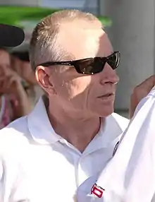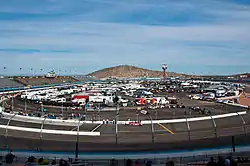 Phoenix International Raceway is one of five short tracks to hold NASCAR races; the others are Richmond International Raceway, Dover International Speedway, Bristol Motor Speedway, and Martinsville Speedway.[2] The standard track at Phoenix International Raceway is a four-turn short track oval that is 1 mile (1.6 km) long.[3] The first two turns are banked from 10 to 11 degrees, while the final two turns are banked from 8 to 9 degrees.[4] The front stretch, the location of the finish line, is banked at three degrees. The back stretch, nicknamed the 'dogleg', varies from 10 to 11 degree banking.[4] The racetrack has seats for 76,800 spectators.[3]