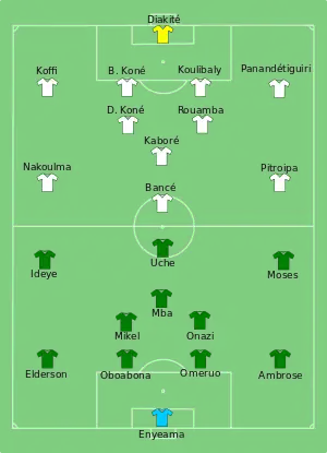 Nigeria had several chances to extend their lead in the second half, but none were converted.[25] In the 77th minute, Wilfried Sanou forced a fingertip save from Nigerian goalkeeper Vincent Enyeama to prevent an equaliser.[29][30]