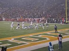 Baylor received the ball to open the second half and promptly put together a deliberate 14-play, 77-yard drive capped by an 11-yard, one-handed touchdown reception by WR Antwan Goodley from QB Bryce Petty. With S Ahmad Dixon eligible to play (Dixon was serving a one-half suspension for a targeting penalty committed during the third quarter of the TCU game), the Baylor defense forced a Longhorn punt, and the Bears again marched down the field for a second touchdown, the score this time coming on a 6-yard pass from Petty to WR Levi Norwood. The Baylor defense would again force a Texas punt, and the Bears offense would score for a third time on their third possession of the second half when Aaron Jones converted a 42-yard field goal. The score would remain 20–3 until early in the 4th quarter, when McCoy, scrambling in the backfield on a broken play, found RB Malcolm Brown in the back of the end zone for a 2-yard touchdown pass. The Bears would respond on their next drive with another field goal to make the score 23–10 in favor of Baylor. Both teams' ensuing drives would stall before Texas took possession with just over 5 minutes remaining, still down 13. The Longhorns drove into Baylor territory, but McCoy was again intercepted by CB KJ Morton, who returned the interception for an apparent touchdown. However, the score was overturned due to a penalty and Baylor took possession inside the red zone. On the next play from scrimmage, RB Glasco Martin IV broke free for an 18-yard touchdown rush to put the Bears ahead 30–10. That touchdown would prove to be the final scoring play in the history of Floyd Casey Stadium: the Baylor defense forced a Longhorn punt on Texas' final possession, and the Bears' offense ran out the clock to spark a celebration at midfield.
