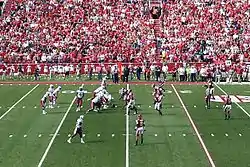 South Carolina Gamecocks offense (in white) prepares to snap the ball against the Arkansas Razorbacks defense