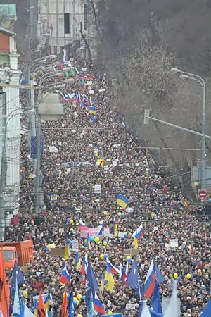 ![]() At least 30,000 people with Russian and Ukrainian flags, flags of political parties and peace symbols. | |||
