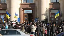 On 1 March, regional state administration (RSA) buildings in various eastern Ukrainian oblasts were briefly occupied by pro-Russian activists. By 11 March, all occupations had ended, after units of the local police and the Security Service of Ukraine (SBU) re-took the buildings.[59] In Donetsk, protests escalated into violence on multiple occasions, including on 13 March, when a pro-Ukrainian protester was stabbed to death.[60][61] In Kharkiv, Patriots of Ukraine militants killed an anti-Maidan protester and a passer-by on the night of 15 March, when anti-Maidan protesters attacked the Right Sector headquarters in the city.[36]