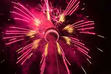 Young diver Faith Zacharias comes on stage again and lights a new torch, and she passed it onto the members of the silver medal women's 4 × 400 m relay winning team at the 1984 Summer Olympics (in order): Dana Wright, Charmaine Crooks, Jillian Richardson, Molly Killingbeck and Marita Payne-Wiggins. Wiggins then passes of the torch to her son, NBA basketball player Andrew Wiggins. Wiggins then runs up the bleachers of the stadium to the final torchbearer retired NBA Player Steve Nash. Nash then runs outside the stadium where he ignites a bowl, which transfers the fire to the official cauldron. The ceremony concluded with a fireworks display shot off the CN Tower, and all the performers back on stage to celebrate.[8][9][10]