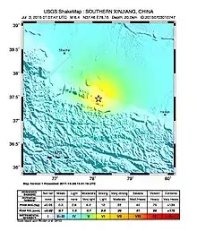 A magnitude 6.4 earthquake struck in Pishan County, Hotan Prefecture, Xinjiang, China 95 km (59 mi) southeast of Yilkiqi (يىلقىچى يېزىسى / 依力克其乡), on July 3 at a depth of 20.0 km (12.4 mi).[1] The earthquake killed at least 3 people and wounded 71.[2][3]