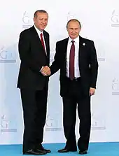 A few hours after the incident, Russian President Vladimir Putin spoke from Sochi, where he was meeting with King Abdullah II of Jordan, saying that it was a "stab in the back by terrorist accomplices,"[50][90] that Russia would not put up with attacks like this one[44] and that Russia–Turkey relations would be affected. Foreign Minister Sergey Lavrov was due to visit Turkey the next day, and Turkish President Recep Tayyip Erdoğan had scheduled a visit to Russia later in the year.[91][92][93] Lavrov cancelled his trip after the incident.[88] Lieutenant General Sergey Rudskoi said that forces threatening Russia would be targeted. Protesters pelted the Turkish embassy in Russia with eggs before police cleared the area.[94] On 26 November, Prime Minister Dmitry Medvedev announced broad economic sanctions against Turkey that would affect their joint investment projects,[95] including the possible shelving of a multibillion-dollar deal to build Turkish Stream gas pipeline through Turkey.[96] Chechen leader Ramzan Kadyrov said that Turkey would regret its actions.[97] Putin accused Turkey of helping ISIL in the illegal oil trade, saying that funds from the sale of oil were used to support terrorists.[98] The Russian Air Force had recently started bombing the oil tankers en route to other countries, including Turkey, and the infrastructure for processing and storage of crude oil.[99][100] Putin later claimed that the Turkish shoot-down was an "ambush" that had been prepared in advance.[101] A bill making denial of the Armenian Genocide illegal has been introduced in the Russian State Duma.[102]