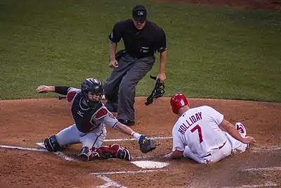 Bench coach Mike Aldrete vacated the Cardinals on October 27 for the same avocation with the Oakland Athletics.[19] The day after the World Series ended, October 30, Mark Ellis, Justin Masterson, Jason Motte, Pat Neshek, and A. J. Pierzynski all filed for free agency.[20] Four of the five players in the group signed with different teams in the 2014–15 off-season.[21][22][23][24] Only Motte, a former closer, had played for the Cardinals prior to 2014. He acceded a one-year contract with the Chicago Cubs.[22] The only free agent who did not endorse with another club was Ellis, who announced his retirement as a player on February 26, 2015.[25]