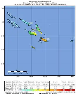 On 9 December 2016 at 4:38 a.m. (UTC +11) local time (17:38:46 UTC), the Solomon Islands region was rocked by an Mww7.8 earthquake, centered 30 km off San Cristobal Island, about 61 km southwest of Kirakira, the capital of Makira-Ulawa Province.[1] Initially registering magnitude 8.0, later downgraded to 7.8, the temblor prompted tsunami warnings that kept countries surrounding the Coral, Tasman and Solomon Sea on high alert, but was later cancelled. A large aftershock of magnitude 6.9 occurred shortly afterwards. This earthquake was largely felt, waking many residents who later ran to high ground for fears of a potential tsunami.[2] The earthquake killed a child and affected some 34,000 people in Makira, South Malaita and Guadalcanal Island where many had lost their homes or had no access to basic needs.[3] Earthquakes are common in this region, with little or no fatalities. This earthquake is tied with three other magnitude 7.8 earthquakes for the second largest earthquake of 2016.[4] On December 17, the Solomon Islands would be rattled again by a 7.9 magnitude earthquake, this time 54 km east of Taron, Papua New Guinea.