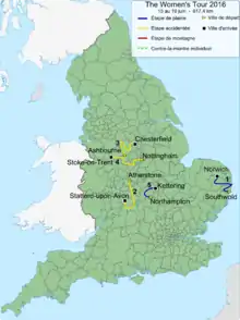 1. "Stages". Women's Tour. Retrieved 7 May 2016.