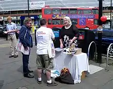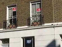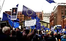 In October 2015, Britain Stronger in Europe, a cross-party group campaigning for Britain to remain a member of the EU, was formed.[82] There were two rival groups promoting British withdrawal from the EU that sought to become the official Leave campaign: Leave.EU (which was endorsed by most of UKIP, including Nigel Farage), and Vote Leave (endorsed by Conservative Party Eurosceptics). In January 2016, Nigel Farage and the Leave.EU campaign became part of the Grassroots Out movement, which was borne out of infighting between Vote Leave and Leave.EU campaigners.[83][84] In April, the Electoral Commission announced that Britain Stronger in Europe and Vote Leave were to be designated as the official remain and leave campaigns respectively.[85] This gave them the right to spend up to £7,000,000, a free mailshot, TV broadcasts and £600,000 in public funds. The UK Government's official position was to support the Remain campaign. Nevertheless, Cameron announced that Conservative Ministers and MPs were free to campaign in favour of remaining in the EU or leaving it, according to their conscience. This decision came after mounting pressure for a free vote for ministers.[86] In an exception to the usual rule of cabinet collective responsibility, Cameron allowed cabinet ministers to campaign publicly for EU withdrawal.[87] A Government-backed campaign was launched in April.[88] On 16 June, all official national campaigning was suspended until 19 June after the Murder of Jo Cox.[89]
