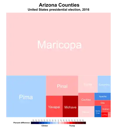 Donald Trump won Arizona with a margin of 3.5%, a reduced margin from Mitt Romney's 9.03% margin in 2012.[21] Arizona was among the eleven states in which Hillary Clinton outperformed Barack Obama's margin in 2012,[22] primarily due to an increase in Hispanic voter turnout in southern Arizona, including heavily populated Maricopa County. Maricopa County in particular went from a 10.69% margin of victory for Romney in 2012 to a 2.84% margin of victory for Trump—one of only three times that a Democrat has come closer to carrying the county since 1964. Indeed, the only closer margin since that time came in 1996, when Bill Clinton won it by 2.2%.