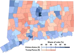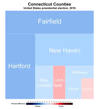 Trump's strongest county in the state was rural Litchfield County, while Clinton's biggest win was in adjacent, more urban Hartford County. [5] Areas that swung in Clinton's favor were mainly concentrated in suburban Fairfield County, in towns like Darien, New Canaan, and Westport.[6] [7]This area is home to many New York City commuters. Other Democratic swings were in suburbs outside Hartford, such as Granby, East Granby, and Glastonbury, as well as outside New Haven.[8][9]