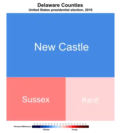 Clinton won the state with 53.4% of the vote. Conversely, Trump received 41.9% of the vote.[2] Although Democrats had once again carried Delaware and its electoral votes, the state swung 7.19% Republican from the 2012 election, and Kent County flipped red. However, as of 2020, it is the last time the county was red in a presidential election. This was the first time since 1968 that Delaware did not vote for the same candidate as neighboring Pennsylvania.