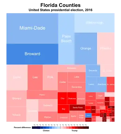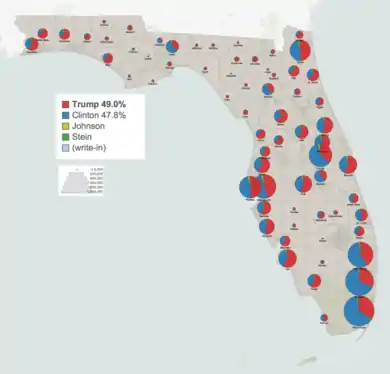 Florida voted for Donald Trump by a margin of 1.2%.[27] It was the fifth-closest state result, with only Wisconsin, Michigan, New Hampshire and Pennsylvania closer. According to the National Election Pool, Trump got a majority of 54% from the Cuban-American voters in the state—in comparison to the 71% of Clinton support by Latino voters from other origins.[28]