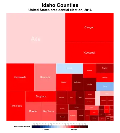 Trump carried the state with 59.25% of the vote, while Clinton received 27.48%. Third party candidate Evan McMullin carried 6.75% of the popular vote, making Idaho his second-strongest state, only after neighboring Utah.[3]