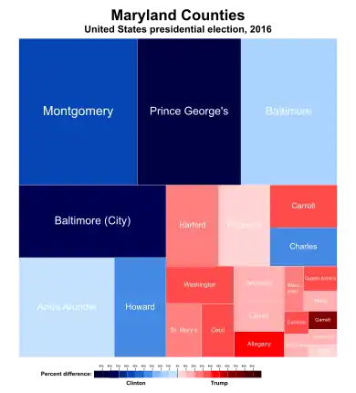 Clinton won Maryland with 60.3% of the vote, while Trump received 33.9%.[3] Maryland was among the eleven states in which Clinton improved on Barack Obama's 2012 performance, although she only improved by less than 100 votes.[4] Maryland was one of four states in which Clinton received over 60% of the vote, the others being Massachusetts, Hawaii, and California; out of the four, however, Maryland was the only one to have voted more Democratic in both 2012 and 2016.