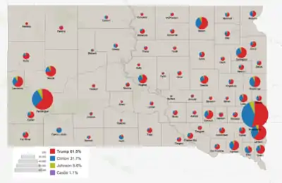 South Dakota has voted for the Republican ticket in every election since 1968. Donald Trump continued the Republican tradition in South Dakota, carrying the state with 61.5% of the vote, to Hillary Clinton's 31.7% of the vote,[1] a 29.8% margin of victory, the largest for either party candidate since Republican Dwight D. Eisenhower's 38.5% margin in 1952. South Dakota was also Libertarian Party candidate Gary Johnson's fifth strongest state in the 2016 election, which his 5.63% in popular vote being only behind New Mexico, North Dakota, Alaska and Oklahoma.[2]