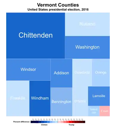 Hillary Clinton easily won Vermont, regarded as one of the most progressive states in the country, with 55.7% of the vote,[1] a vote margin of 25.9% compared with the President Barack Obama's 35.6% vote margin in 2012.[2] Donald Trump received 29.8% of the vote and won Essex County—the most rural and sparsely populated county in the state—thus making him the first Republican presidential candidate to win a county in Vermont since George W. Bush in 2004.