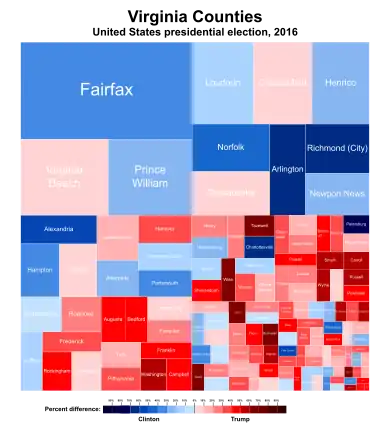 The Democratic Party candidate, Hillary Clinton of New York, carried Virginia with a 49.73% plurality in the popular vote against businessman Donald Trump of New York, who carried 44.41%, a victory margin of 5.32%. Clinton seemed to benefit from having former Virginia governor Tim Kaine on the ticket. Whereas the national popular vote swung 1.77% Republican from the previous election, Virginia swung 1.44% Democratic.[2] (Due to a higher third-party vote, Clinton's percentage was lower than Obama's in both 2008 and 2012, however.) Kaine himself became optimistic on election night after it became clear that he and Clinton would win Virginia by a larger margin than Obama did in 2012. His optimism soon faded, however, as it was announced that Clinton had lost many other important swing states to Trump.[3]