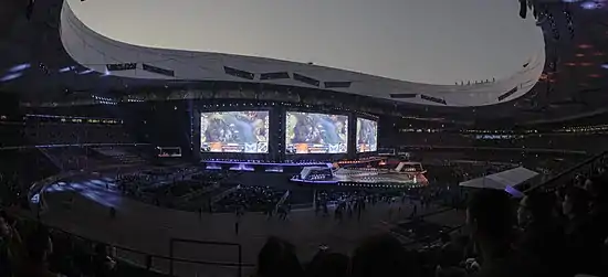 During the opening ceremony of the finals, dancers were decked out in different masks, unified as the ground around them exploded with visual effects and colors. It was followed by Jay Chou's Worlds 2017 remix Hero performance, and a live version of Legends Never Die by Against the Current, with Chou playing the piano behind. An augmented reality dragon (modeled after the in-game Elder Drake) also flew and soared around the arena halfway through the performance, with a giant Summoner's Cup rising from the grounds of the stadium at the same time, catching the stadium's audience and global fans by surprise. The closing ceremony featured Alan Walker performing his own remix of Legends Never Die, with Chrissy Costanza on the vocals.[17] The overall performances of the ceremony received widespread praises.[4][5]
