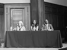 Lyda Krewson (left), Tishaura Jones (center), and Lewis E. Reed (right) at a mayoral forum. Krewson, Jones, and Reed respectively won the most votes.