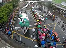 The traditional Parade of Stars which featured floats of the film festival's eight entries took place in Parañaque on December 23, 2018 and was planned to traverse a route measuring 12.3 km (7.6 mi).[7] The parade began near Shopwise Santana Grove in Sucat, where an estimated crowd of 300,000 waited for the start of the event,[7] and ended on Bradco Avenue. The parade route also included Dr. A. Santos Avenue, V. Medina Avenue, Quirino Avenue, NAIA Road, and Macapagal Boulevard. The Parañaque Traffic and Parking Management Office closed a significant portion of Dr. A. Santos Avenue starting from Sta. Rita Avenue from vehicular traffic beginning of noon of the day of the parade with assembly and preparation of the event scheduled to begin at 1pm.[5] The normally eastbound lanes of Dr. A. Santos Avenue from Soreena to Kabihasnan, eastbound lanes of NAIA Road from Quirino Avenue to Macapagal Boulevard, and southbound lanes of Macapagal Boulevard from NAIA Road to Bradco Avenue were also temporarily opened for counterflow in an effort to manage anticipated heavy traffic situation caused by the parade.[6]