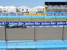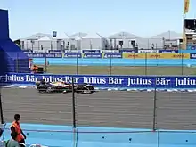 The first group of five drivers was predicted to be a disadvantage as the circuit was still slippery from the sand being blown from the beaches but had no one make contact with the barriers lining the track.[25][26] Di Grassi was the early pace setter with Maro Engel, Jérôme d'Ambrosio, Luca Filippi and Blomqvist following in positions two to five.[26][1] Lynn was the second group's fastest driver despite losing time in the final third of the lap preventing him going quickest overall.[26] Lynn demoted the previous fastest group driver López who made an error on his lap and took third, behind the second-placed Lotterer but ahead of Félix da Costa.[25][1] Prost was the second group's slowest competitor because he bent his car's steering arm when he hit a trackside bollard, which speared him into the wall at a 45-degree angle at high speed leaving the turn 15 and 16 chicane.[27][28] His team was required to repair his car for the afternoon's race.[29] In the third group, a vast improvement in track conditions allowed most drivers to go faster than di Grassi in the first two sectors but not overall.[26] Evans led the group with Turvey second. Both demoted Abt to third and Mortara was fourth.[25][1] The session was disrupted when Heidfeld entered the turn 17 chicane too fast and understeered into a TecPro barrier.[29][30] This caused Mortara to abandon his first timed lap and was granted dispensation to set a second, which he did not take up.[28]