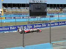 Vergne was affected by radio communication issues that made him uncertain as to how much electrical energy he had left as di Grassi followed close behind but was unable to affect an overtake by the time they entered the pit lane for the switch into their second cars on lap 19 with the majority of the field following suit.[41][43][44] López led for one lap before he, d'Ambrosio and Prost made their pit stops on the next lap.[1] After the pit stops, Vergne and di Grassi retained first and second places. Abt was third and Bird left the pit lane alongside teammate Lynn and passed him for fourth.[37][38] Similarly, Rosenqvist and Evans moved to fifth and sixth.[1][35] Di Grassi attempted to pass Vergne on the left into turn 17 on his first lap out of the pit lane and the two briefly made contact, causing di Grassi to lock his brakes and go sideways.[35][41][44] Di Grassi lost almost two seconds of time but began closing back up to Vergne.[43][44] Two laps later, Bird pressured Abt and the battle continued until Abt entered the pit lane on lap 23 because his seat belts unbuckled under braking though post-race data confirmed that the shoulder harnesses were correctly fitted.[3][47] Abt rejoined in 15th after Bird took over third.[37]