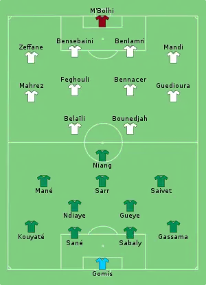 Both Senegal and Algeria were grouped in Group C of the 2019 Africa Cup of Nations. Senegal entered the group stage with an easy 2–0 win over Tanzania.[4] However, Senegal suffered a big setback after losing 0–1 defeat to the Algerians when Sadio Mané made his debut in the tournament.[5] Senegal soon bounced back by a 3–0 win over Kenya,[6] thus qualified to the round of sixteen with the Algerians. Senegal managed to beat both Uganda[7] and Benin[8] in the round of sixteen and quarter-finals with the same 1–0 results. Senegal, in the semi-finals against Tunisia, struggled harder due to Tunisia's defensive style of play and almost got led by the Tunisians until Ferjani Sassi missed the penalty; Henri Saivet also failed to convert from the spot after his side got the same opportunity, but the Senegalese got a lucky own goal by Dylan Bronn to finally obtain another 1–0 win after 120' to march to the final for the second time, having done it so in 2002.[9][10]