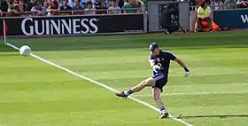 Peter Keane's decision to bring in Jack Barry instead of Killian Spillane limited the effectiveness of Dublin's Brian Fenton.[20] Dublin played facing the Railway End in the first half.[21] Nevertheless, Paul Mannion had pointed to put Dublin into the lead within 17 seconds.[21] A David Clifford miss for Kerry was followed by Seán O'Shea equalising for the Kingdom.[21] By the fifth minute Dublin were in the lead by 0–3 to 0–1, Dean Rock having scored one from play and one free.[20][21] Paul Geaney had a goal chance for Kerry in the seventh minute, beating Stephen Cluxton in the Dublin goal only for James McCarthy to clear the ball off the line.[21] Clifford missed again.[21] Then he scored a point.[21] Jonny Cooper conceded a penalty to Kerry while holding onto Clifford.[21] Having stepped off his line in advance of Geaney striking the ball, Cluxton saved; and Sean O'Shea levelled the game from the resulting '45.[21] Stephen O'Brien and Mannion exchanged scores before referee David Gough showed Cooper the yellow card for persistent fouling, after another tangle with Clifford.[21] Sean O'Shea put Kerry ahead with the free.[21] Then Jack McCaffrey scored his fourth championship goal to give Dublin a 1–4 to 0–5 lead.[20][21] Dublin's Rock and Kerry's O'Shea continued to exchange points until the end of the half (Con O'Callaghan's score being the only exception). Then, with the break approaching, Cooper fouled Clifford once more and received a second yellow card and then a red, reducing Dublin to 14 players.[20][21] Sean O'Shea sent the resulting free between the posts to leave the half-time score at Dublin 1–9 Kerry 0–8.[21]
