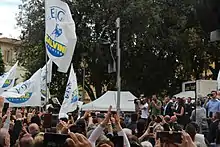 In March 2019, Nicola Zingaretti was elected secretary of the PD.[9] In April, Zingaretti presented a special logo for the election, including a large reference to "We Are Europeans", a manifesto launched by Carlo Calenda; and the symbol of the Party of European Socialists (PES).[10] Additionally, the PD is trying to forge an alliance with the Article One (Art.1)[11] and minor parties. March and April registered more developments on the centre-left side of the political spectrum. Under the new leadership of Benedetto Della Vedova, More Europe (+Eu) formed a joint list with Italy in Common (IiC),[12][13][14] the Italian Socialist Party (PSI),[15] the Italian Republican Party (PRI),[16][17] the Italian section of the European Democratic Party (EDP),[18] the Liberal Democratic Alliance for Italy (ALI)[19] and minor parties; Italian Left (SI), the Communist Refoundation Party (PRC), minor parties and individual splinters from the disbanded Free and Equal (LeU) formed The Left (LS), a joint list inspired by the Party of the European Left (PEL);[20] and the Federation of the Greens (FdV), Possible (Pos) and Green Italy (GI) formed Green Europe (EV) under the banner of the European Green Party (EGP).[21][22] On the centre-right side, FI welcomed in its lists candidates of the Union of the Centre (UdC) and several alike minor parties while Brothers of Italy (FdI) formed a partnership with Direction Italy (DI) and minor groups.