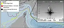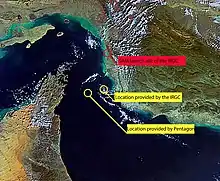 The Iranian account of the drone's location at the time of the shoot-down is contested by the United States. The commander of United States Air Forces Central Command, Air Force Lieutenant General Joseph Guastella, said the "closest that the drone got to the Iranian coast was 21 miles."[25] Later, U.S. Central Command issued a map of the RQ-4A's flight path, showing the attack position as several miles outside Iran's territorial waters. They also released an infra-red image of an apparent explosion destroying the RQ-4A taken from another aircraft at 25°57′27″N 56°52′39″E, 17.3 nautical miles (32.0 km) off Iran's coast.[26][27] The New York Times, citing a senior official in the Trump administration, reported that there were some doubts inside the administration about whether the drone and a Boeing P-8 Poseidon manned aircraft had indeed avoided Iranian airspace throughout their entire flights.[28] Brig. Gen. Amir Ali Hajizadeh, commander of Aerospace Force of the Islamic Revolutionary Guard Corps, said that the U.S. was warned twice about the infringement of Iran's territorial limit and stated: