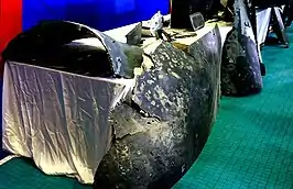 Iranian Major General and IRGC commander Hossein Salami said that the drone took off at 00:14 local time from a U.S. military base south of the Persian Gulf and flying toward Chabahar. He alleged that, on its return journey, it violated the Iranian airspace near the Strait of Hormuz.[18] Iranian Foreign Minister Mohammad Javad Zarif has said that the drone was at 25°59′43″N 57°02′25″E when it was targeted at 04:05 local time (23:35 GMT, June 19).[19] These GPS coordinates put it at 8.3 nautical miles (15.3 km) off Iran's coast, within the 12 nautical miles (22 km) of its claimed territorial waters.[20] According to Iran, the drone was struck by an Iranian-produced 3rd Khordad SAM located near Garuk, Hormozgan Province.[21][22] However, citing a Pentagon official, Newsweek reported the missile as a Russian-origin S-125 Neva/Pechora.[23] Iranian forces displayed sections of the drone, which the foreign minister stated had been retrieved from Iranian territorial waters.[20] According to TIME, smoke from the drone was seen as shown in a video by the U.S military.[24]