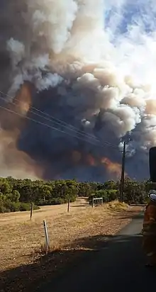 A bushfire started burning on 2 January in areas to the north of Perth. By 5 January, a total area of 2,000 ha (4,900 acres) of bushland had been burned out and properties threatened in Gingin and Dandaragan with residents of Ocean Farms Estate being ordered to evacuate and farmers east of Lancelin also encouraged to leave.[28] By 7 January, 10,000 ha (25,000 acres) of land over the Gingin and Dandaragan shires had been burned with 200 fire fighters combating the blaze.[29]