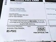 Voters were given a recommended two-hour time slot to cast their vote on Polling Day (from 8 am to 8 pm) on their ballot card as a measure to counter long queues during polling. Measures for safe distancing still apply on polling day. Voters with fever or respiratory symptoms would be denied entry from the polling stations, except during the last hour (7 pm to 8 pm).[66][61] Voters who are unable to vote because of medical issues, or because they are overseas, will be delisted from the registrar of voters due to mandatory voting, but will not need to pay the $50 fee for reinstating their names. Voters had to use hand santitizer before voting, and were initially required to wear disposible gloves, but this was later changed due to the requirement causing long queues.[67][68] Elderly voters above the age of 65 were given a special time slot in the morning. The restrictions caused long queues at polling stations.[69]