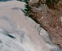![]() Satellite image of the smoke from the wildfires burning in California and Oregon on September 9, 2020 | |