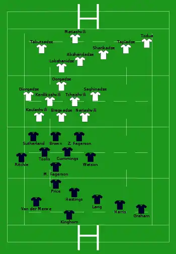 | Try: Graham (2) 2' c, 75' m Brown (2) 27' m, 50' m Watson 32' m McInally 62' c van der Merwe 70 ' c Kinghorn 79' c Con: Hastings (4/8) 4', 62', 71', 80' |