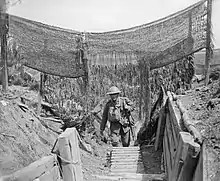 Arriving on 22 January in VI Corps reserve area, officers and N.C.O.s were sent to 14th Division, which the Division was to relieve, to become acquainted with the area. On 4 February VI Corps handed over to the newly formed XIV Corps (20th Division and the Guards Division).[16] The Division was in the northern section of the salient, 2.5 miles (4.0 km) north of Ypres with its left on the canal. The area had been rendered a quagmire by shelling and the trench system was fragmented, shallow and poorly maintained, these remnants being separated by gaps of up to 80 yards (73 m) of mud.[17] On the night of 11–12 February during the first placement of 60th Brigade into the line, the Germans attempted to interrupt the relief, but were thrown back after temporarily capturing one of the trench fragments. They were praised by Army and Corps commanders for their successful actions "...in novel conditions which might have placed them at a disadvantage," and by their own division and brigade commanders. Shortly after this isolated points were abandoned, one of which was 20 yards (18 m) from the German line and connected to it by a sap. The engineers and pioneers began the task of improving the trench system, the size of the task indicated by the fact that for a time 4 long tons (4.1 t) of material per night were being moved from divisional workshops to the 96th Field Company R.E., attached to the 60th Brigade.[18] The difference in conditions in the salient can be seen in the casualty figures for the first month, of around 1,000 men killed, wounded or missing, equal to those of the whole five months while in the Laventie sector.[17]