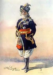 The 14th Murray's Jat Lancers was originally raised at Aligarh as the Jat Horse Yeomanry in 1857, during the Indian Mutiny, and was composed entirely of Hindu Jats.[2] The 15th Lancers (Cureton's Multanis) was formed at Lahore in 1858 from Multani Pathans, and had originally been raised in 1857 as The Multani Regiment of Cavalry.[2][3] The new 20th Lancers regiment formed by their amalgamation comprised one squadron each of Punjabi Muslims, Jat Sikhs, and Hindu Jats.
