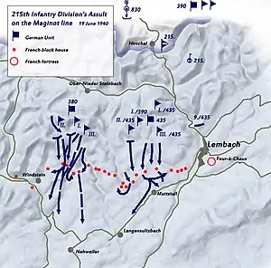 For the assault, the 215 division formed two battle groups based on Infantry Regiments 380 and 435, reinforced with pioneers and proceeded by a heavy 2 hour long bombardment from divisional and attached heavy artillery. Dive bomber support was also available from the Luftwaffe. In the initial attack, battle group 380 captured 2 blockhouses by clambering on their roofs and dropping explosive charges into their embrasures. Utilizing the gap in the line, further casements were outflanked and attacked from the rear, by nightfall 6 blockhouses had been captured in its sector. The fortress of Four-à-Chaux consisted of six blocks of which four had artillery pieces, its 75mm gun had the longest range and covered the blockhouses to its left. It also had shorter range 81mm and 135mm weapons. These weapons poured fire on the 435th Regiment attack, whilst the further blockhouses were covered by the more distant 75mm gun turret of the Grand Grand Hohékirkel.[3] The Germans had found the French artillery support heavy but hampered by lack of direct observation ineffective. The assault group from the 435 Infantry Regiment had similar success, so that the division was poised to exploit the breaches the following morning.