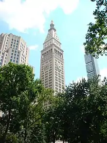 The Metropolitan Life Insurance Company (MetLife), headquartered at 1 Madison Avenue at East 23rd Street, played a significant role in shaping the character of development along East 23rd Street in the early 20th century, constructing six buildings successively along the street and around the block to the corner of 24th. The tallest of these is the 700-foot (210 m) Metropolitan Life Insurance Company Tower, built in 1909 at the intersection of 24th Street and Madison Avenue.[28] The tower, with its ornate clocktower faces, was one of Manhattan's first skyscrapers.[29] For four years, until the construction of the Woolworth Building in 1913, it was the tallest building in the world.[28] It also owned a building across the street, which was the location of the 23rd Street Fire that killed 12 firemen. A new apartment building, the current Madison Green, was announced for the site in the 1970s, but the building itself was not constructed until 1982.[30]