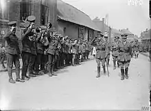 The brigade's machine gun company was moved to the divisional 8th Battalion, Machine Gun Corps on 20 January 1918.[8] In addition, British[lower-alpha 1] divisions on the Western Front were reduced from a 12-battalion to a 9-battalion basis in February 1918 and the brigade from four to three battalions.[10] Thereafter, the brigade commanded three infantry battalions and a trench mortar battery.[8] 1918 saw the return of the war of movement. It had to withstand the German Spring Offensive in the First Battles of the Somme – Battle of St Quentin (23 March), Actions at the Somme Crossings (24 and 25 March), Battle of Rosieres (26 and 27 March), and Action of Villers-Bretonneux (24 and 25 April) – and the Third Battle of the Aisne (27 May–6 June). It then switched over to counter-attack in the Second Battle of Arras (Battle of the Scarpe, 26–30 August) and the Final Advance in Artois in which the 8th Division captured Douai (17 October).[9]