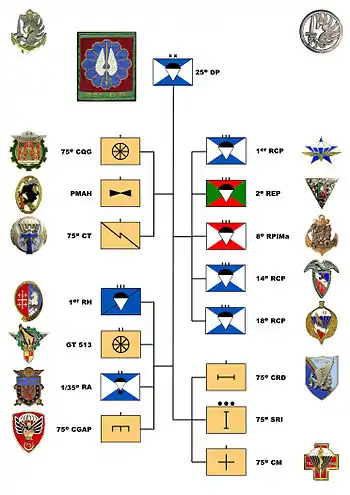 The 25th Parachute Division (French: 25e Division Parachutiste, 25e D.P) was an airborne division of the French Army, part of the French Airborne Units. Consisting mainly of air infantry specialized in airborne combat, air assault and established in 1956; the Parachute Division took principal part only in the Algerian War.
